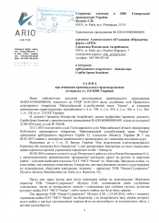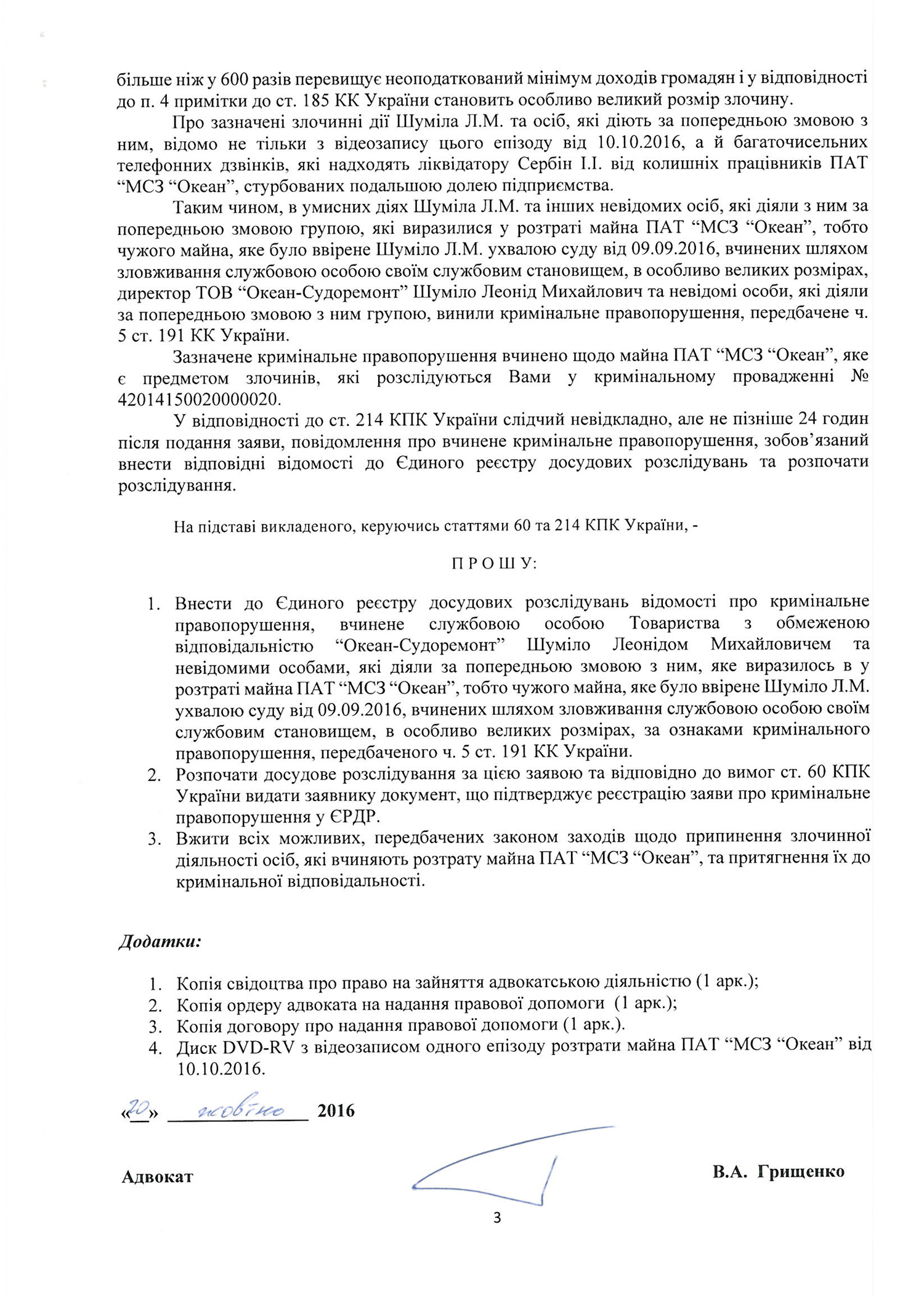 На основании изложенного, заявитель просит внести в Единый реестр досудебных расследований данные об уголовном преступлении, совершенном должностным лицом ООО Океан-Судоремонт Шумило Леонидом и неизвестными лицами, которые действовали по предварительно сговору, которое выразилось в растрате имущества ПАО НСЗ Океан путем злоупотребления служебным положением в особо крупных размерах – по признакам уголовного преступления, предусмотренного частью 5 статьи 191 Уголовного Кодекса Украины. Также заявитель просит начать досудебное расследование и осуществить все действия, чтобы прекратить преступную деятельность лиц, которые осуществляют растрату имущества ПАО НСЗ Океан, и привлечь их к уголовной ответственности.