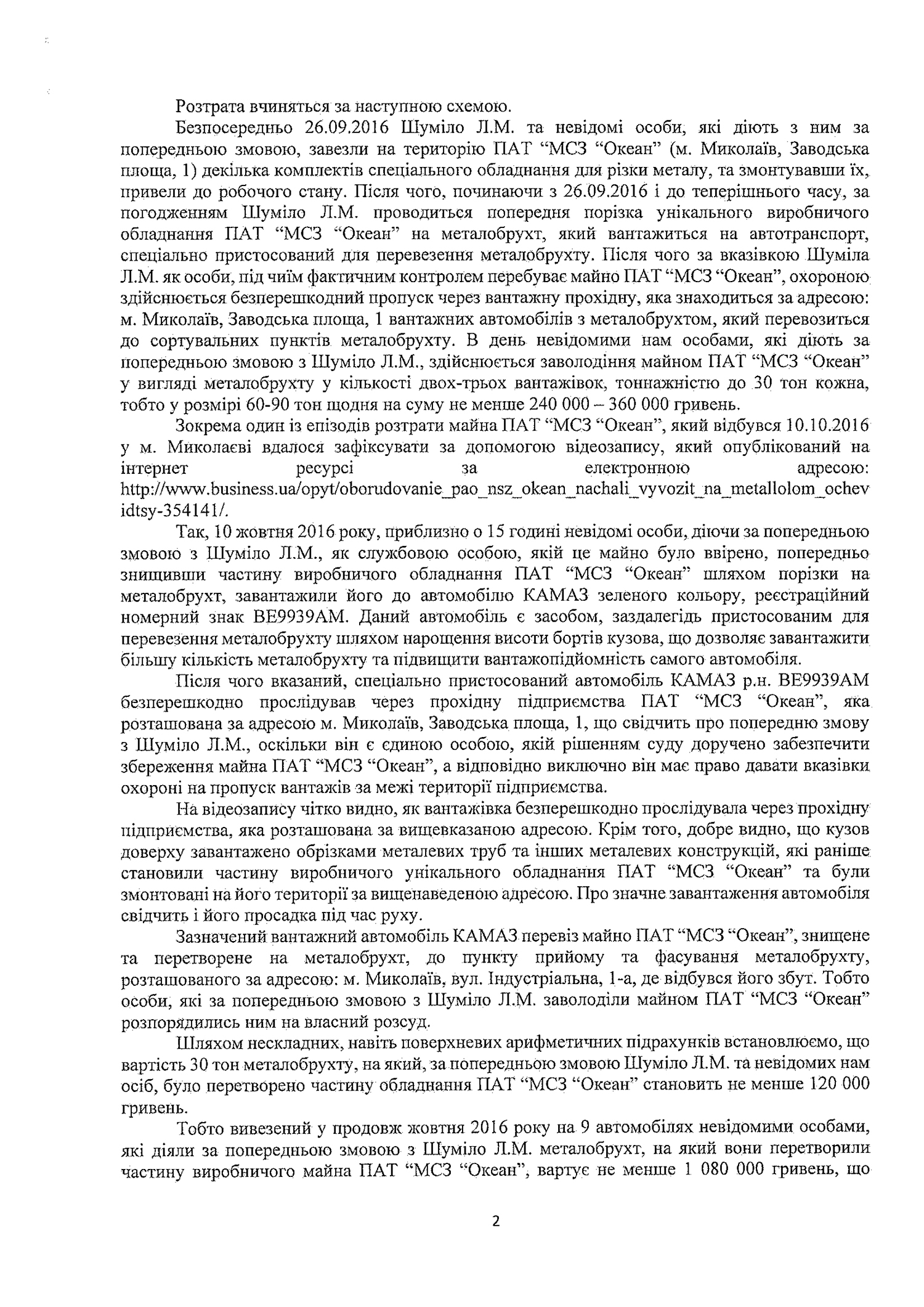 В частности, в тексте Заявление приводятся данные, что в октябре с территории ПАО НСЗ Океан было вывезено 9 грузовиков металлолома, в который была превращена часть оборудования ПАО НСЗ Океан. Стоимость металлолома превышает 1 млн грн, что более чем в 600 раз превышает необлагаемый налогом минимум доходов граждан и составляет особо крупный размер преступления.