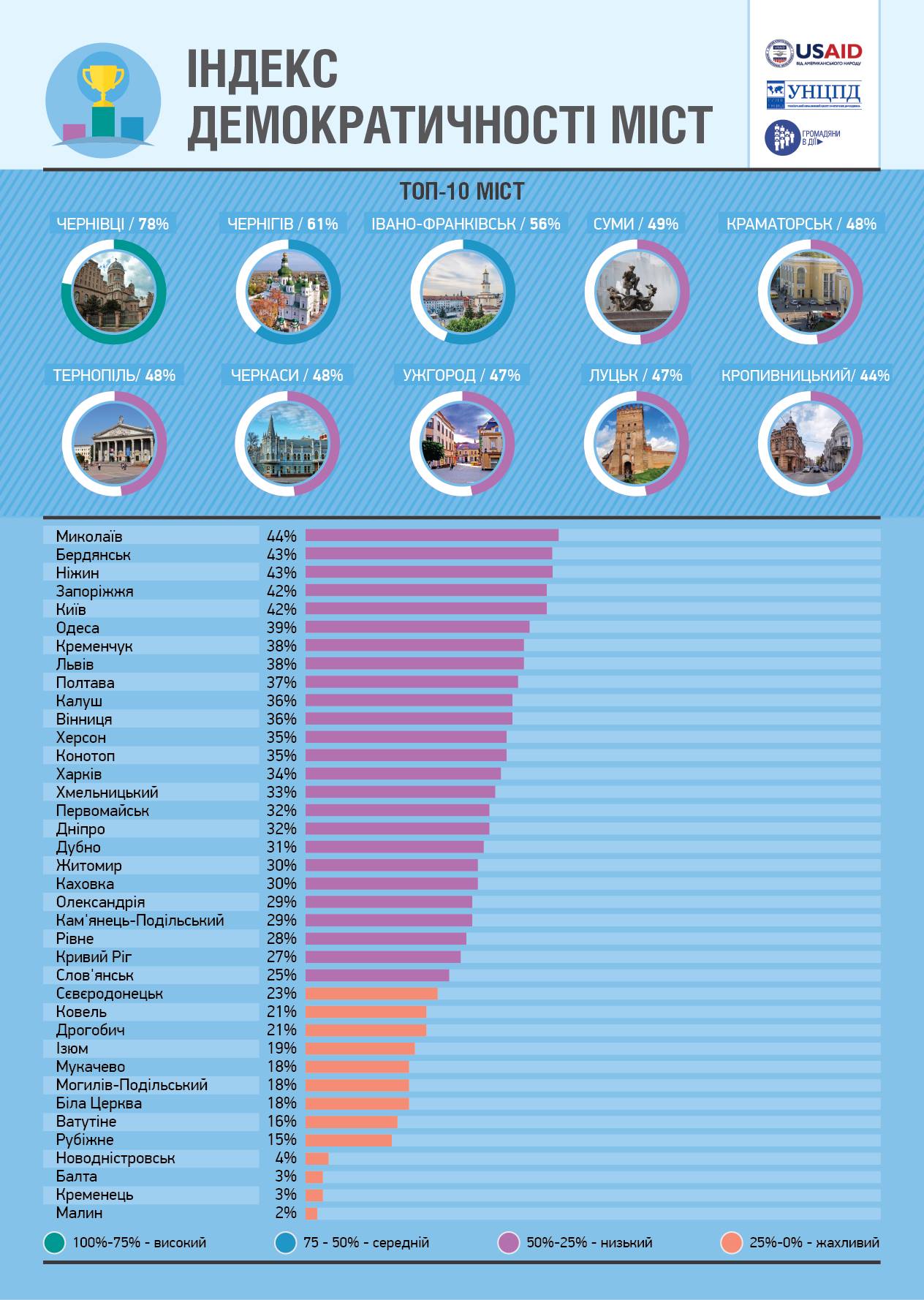 – В рамках исследования мы проанализировали более 700 нормативных документов в 48 городских советах - документы, регулирующие работу городских советов, механизмы местной демократии, прозрачности и открытости власти. В результате имеем рейтинг самых демократических городов Украины, где лучше всего внедрены стандарты демократического управления, – рассказал он.