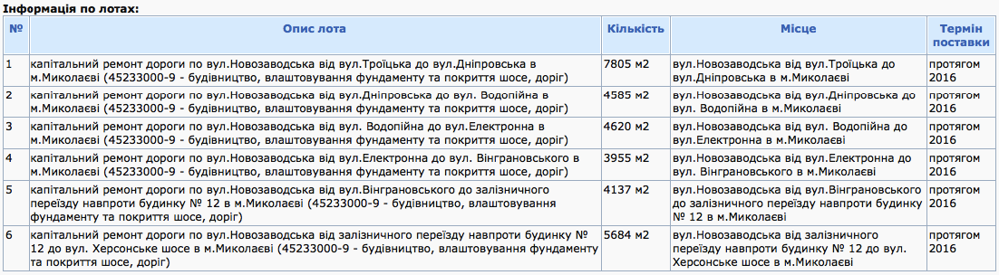 Речь идет о капитальном ремонте дороги на 6 участках улицы Новозаводской от Троицкой до Херсонского шоссе в Ингульском районе Николаева. Предполагалось отремонтировать 30786 м2 дороги на протяжении 2016 года.
