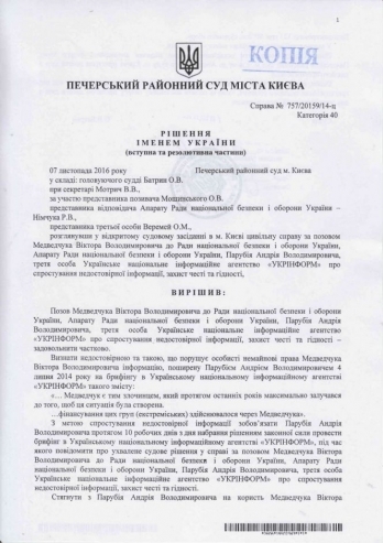 7 ноября 2016 года Печерский районный суд Киева удовлетворил иск Виктора Медведчука о защите чести и достоинства. Ответчиками по этому иску выступали Совет национальной безопасности и обороны Украины и его бывший секретарь Андрей Парубий.