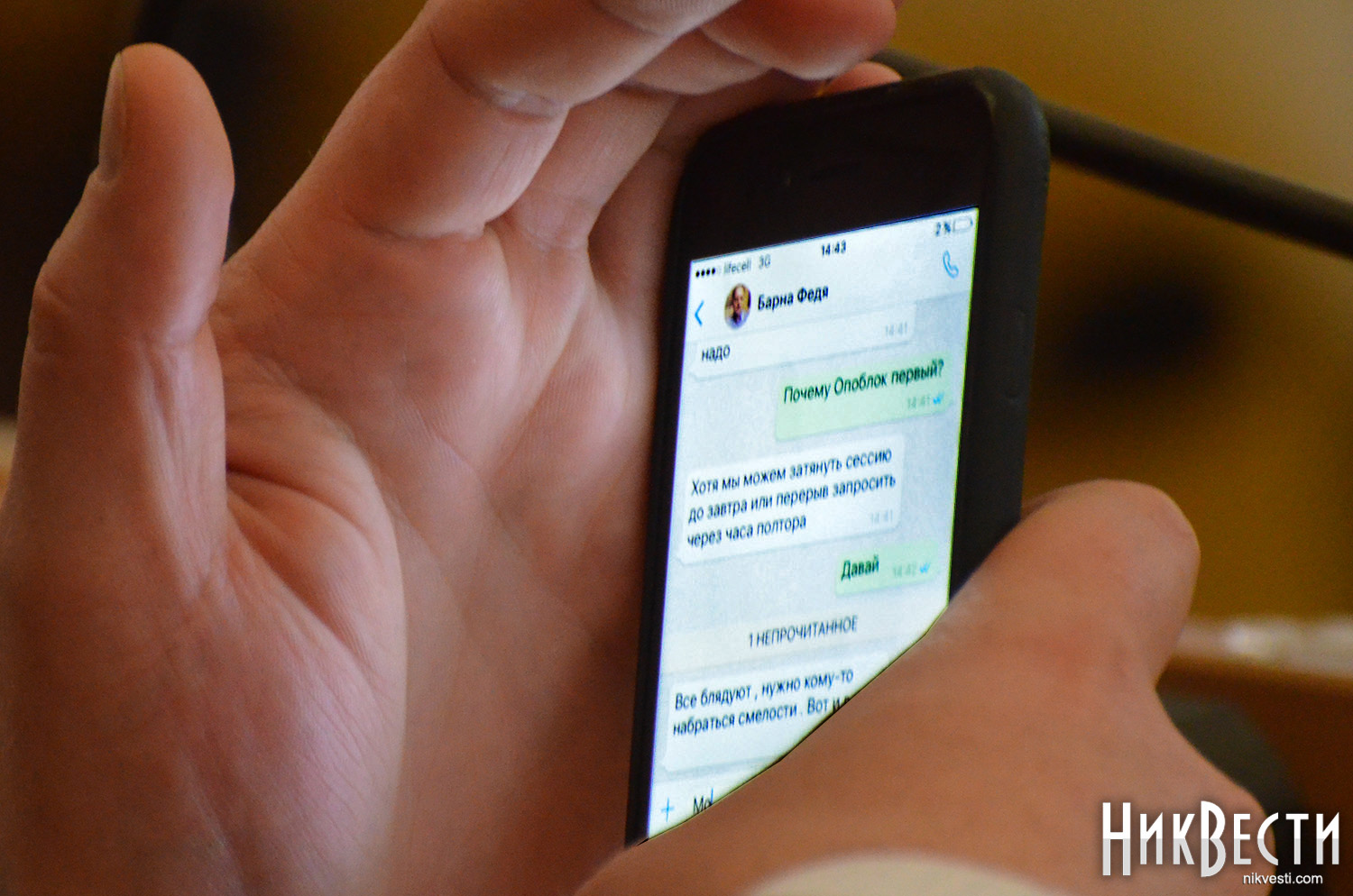 Исходя из переписки, депутат от «Блока Петра Порошенко «Солидарность» просил «Оппозиционный блок» первыми выступить против председателя Николаевского областного совета Виктории Москаленко. Впоследствие он предложил вообще прервать заседание, на повестке дня которого имеется более 40 вопросов.
