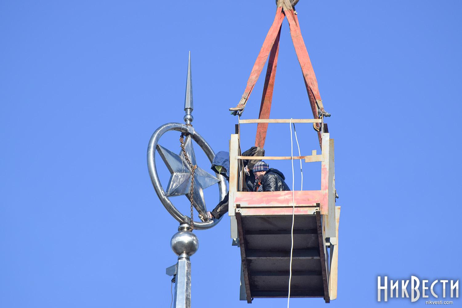 Ранее сообщалось, что советская пятиконечная звезда на здании Николаевского городского совета, символизирующая «единство мирового пролетариата пяти континентов Земли», заменена на государственный герб Украины.