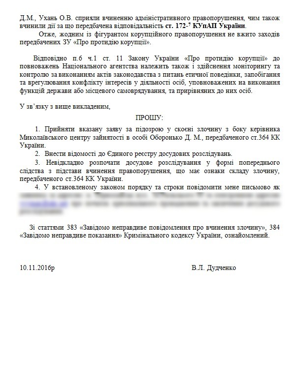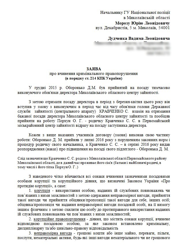 Об этом идет речь в заявлении на имя руководителя Главного управления Национальной полиции в Николаевской области Юрия Мороза, копию которого заявитель, недавно уволенный директор Первомайского районного центра занятости Вадим Дудченко, прислал на почту редакции НикВестей.