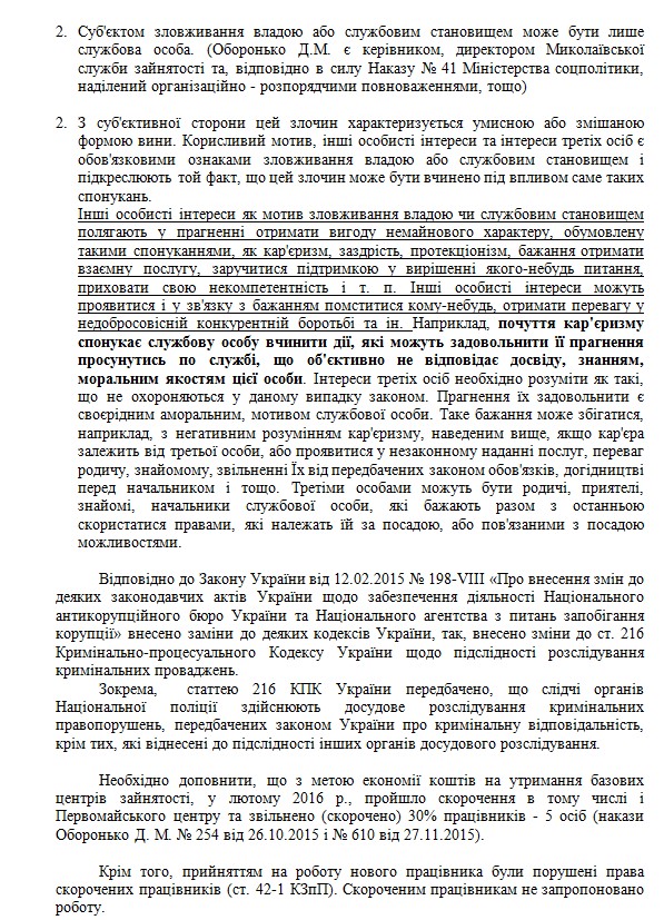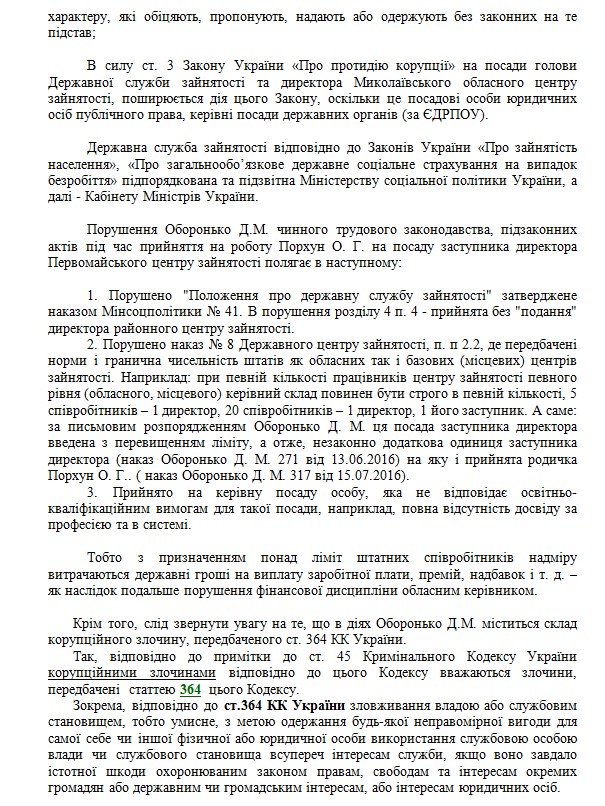 - Дмитрий Оборонько в настоящее время активно занимается карьерным продвижением Елены Порхун на должность директора Первомайского центра занятости. Так, для осуществления поставленных целей устраняет действующую администрацию: за период с август сентябрь осуществлено более 20 проверок по надуманным основаниям (на которые также тратятся лишние государственные средства), объявлено 3 выговора (в течение одного месяца, два из которых в один день 10.10.2016) директору базового центра занятости и 2 подряд (с интервалом один день 21 и 23 сентября) заместителю директора), - говорится в заявлении.