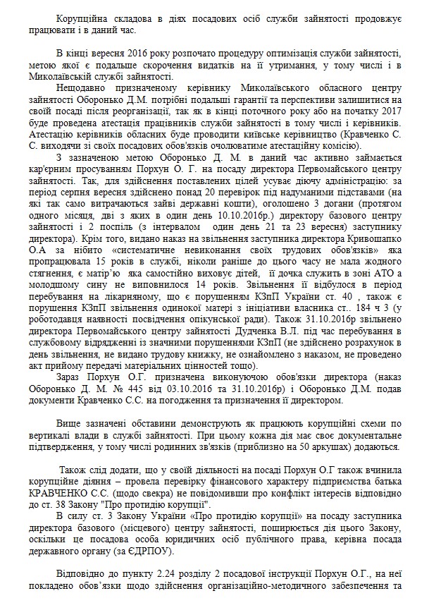 В заявлении Вадим Дудченко также указывает, что директор Николаевского областного центра занятости продолжает активно продвигать Елену Порхун по карьерной лестнице.