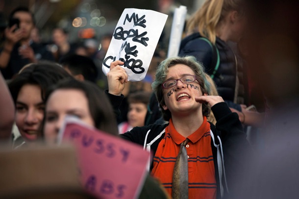 Участники акции несли плакаты «Не мой президент», «Любовь побеждает». Как утверждает представитель одной из частных школ Люк Дюйси, в акции протеста приняли участие свыше 5 000 учеников из 20 средних и высших школ.