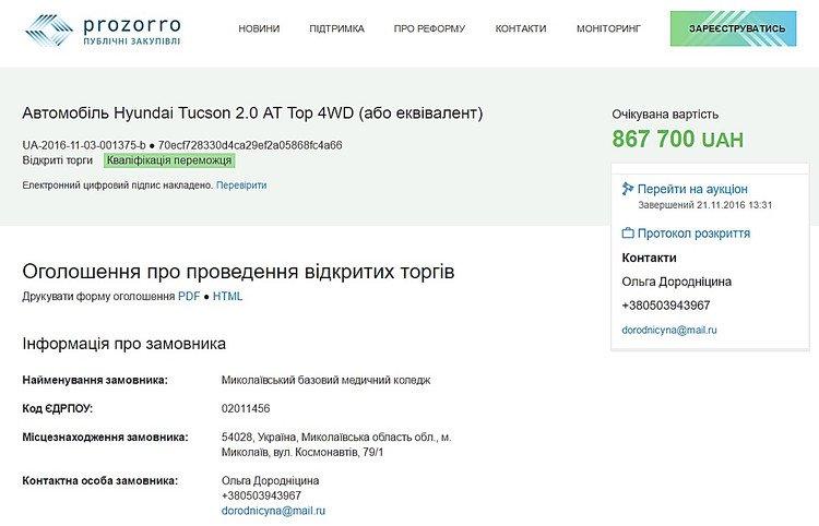 Николаевский базовый медицинский колледж в результате проведенного аукциона купил кроссовер «Hyundai Tucson 2.0 AT Top 4WD» 2016 года выпуска за 820 тысяч гривен.