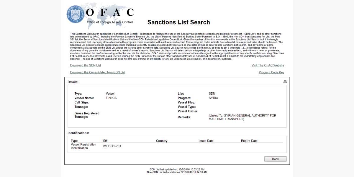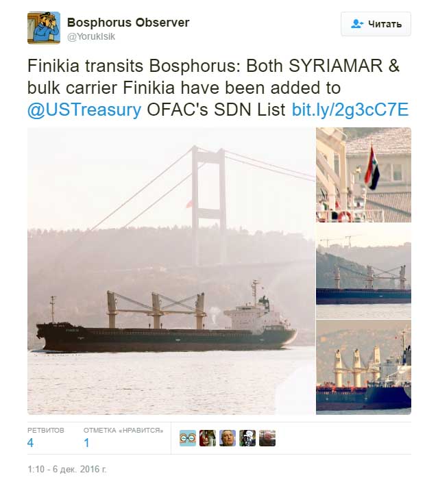 Отметим, что в этом списке, кроме балкера FINIKIA, еще всего лишь два сирийских судна, также принадлежащих Syrian General Authority For Maritime Transport. Это позволяет предполагать, что претензии OFAC относятся не к судовладельцу, а к конкретному судну.