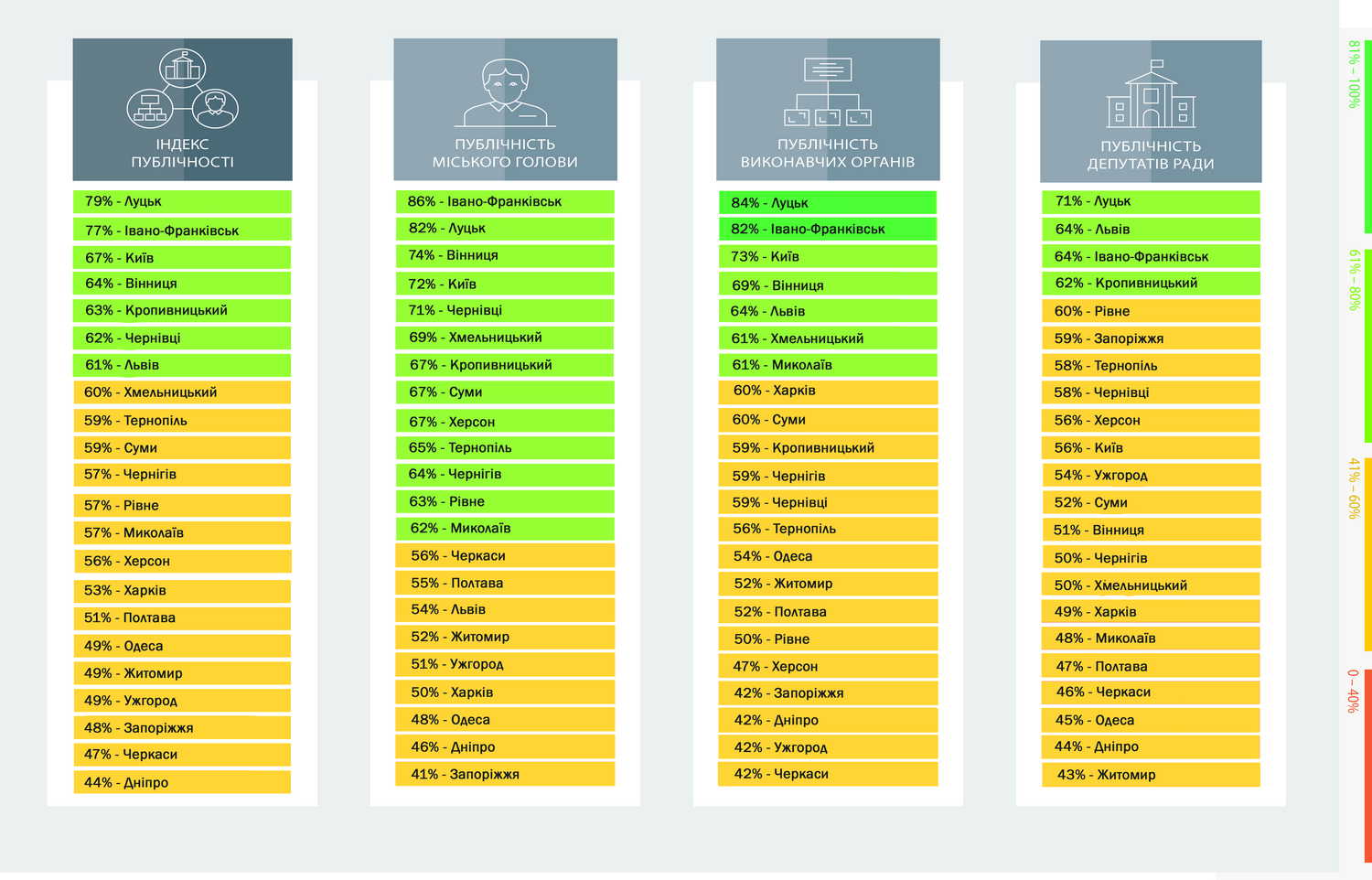 Традиционно наиболее публичными являются исполнительные органы городских советов, показатели публичности исполнительных органов Луцкого и Ивано-Франковского городского совета с показателями 84% и 82% первыми за все годы исследования, пересекли границу 80% и стали публичными.