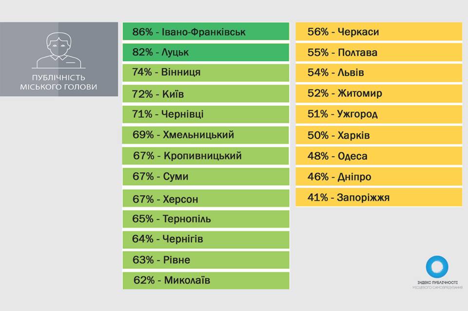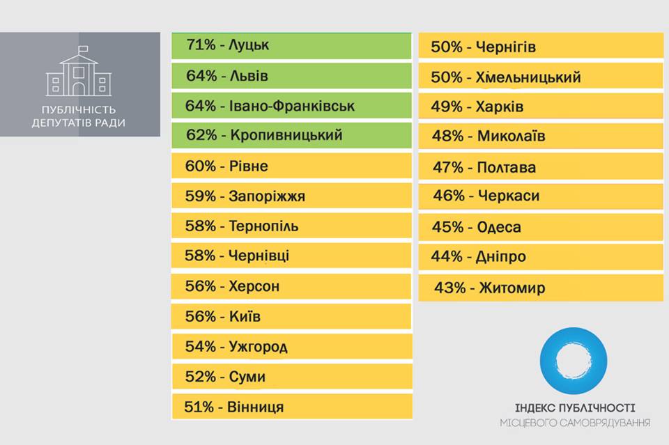 Самые низкие показатели имеют депутаты городских советов. Удовлетворительный уровень публичности показали депутаты Луцкого, Львовского, Ивано-Франковского и Кропивницкого городских советов. Последние же имеют низкий уровень публичности.