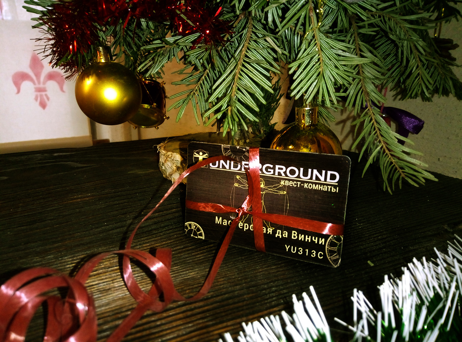 Итак, мы забронировали сеанс в Мастерской да Винчи на сайте https://under.com.ua/, и вскоре уже стояли у красивой деревянной вывески, обмотанной мощными цепями. Создатели комнаты постарались выдержать антураж и оформили под старину даже приемную. Выложенная из кирпича стойка администратора, штандарты на окнах, арочные проемы – всё окружение медленно погружает в атмосферу средневековья. Правда, с нотками праздника: нарядная ёлочка и снежинки прилагаются. Под ёлочкой притаился подарок: сертификат на посещение «Мастерской да Винчи».