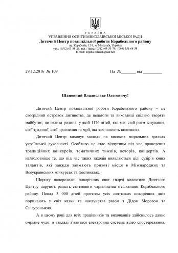 При содействии депутата Николаевского городского совета Владислава Ентина в помещении Детского центра внешкольной работы Корабельного района установлена система видеонаблюдения.