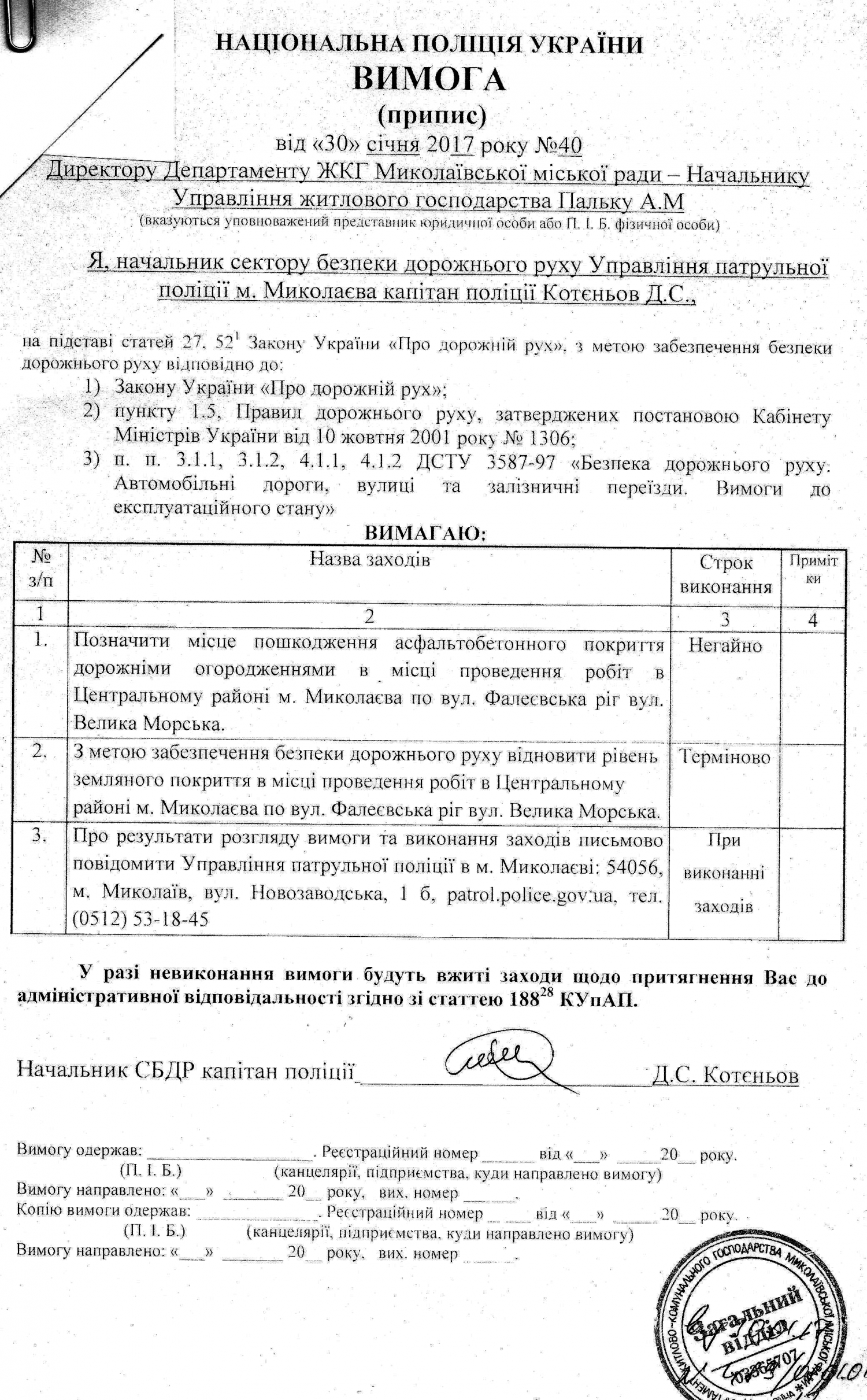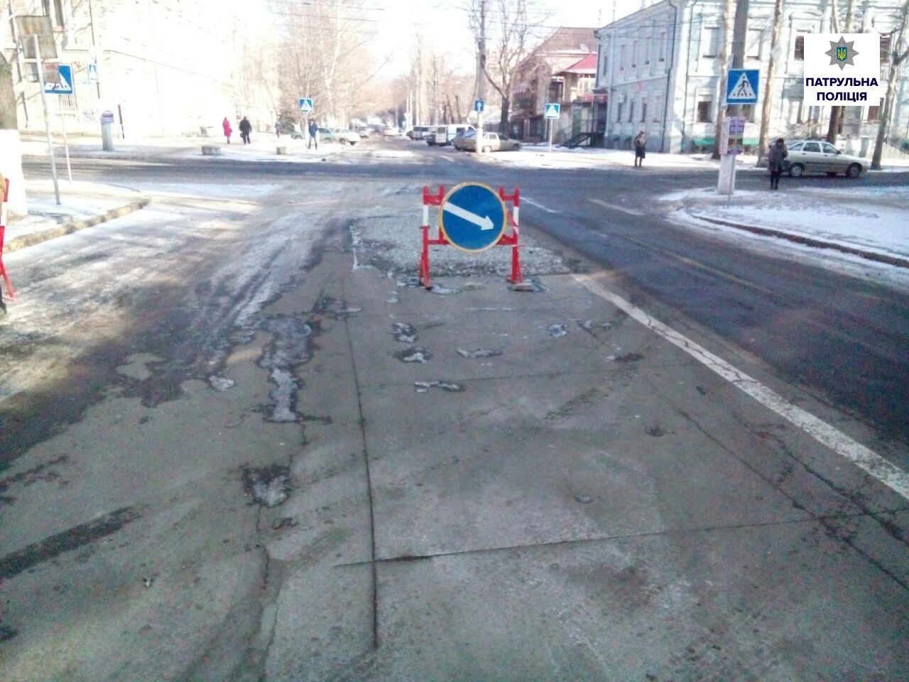 Работники сектора безопасности дорожного движения Управления патрульной полиции Николаеве провели проверку предписаний, направленных в Департамент ЖКХ, по обеспечению безопасности дорожного движения в месте проведения работ на перекрестке улиц Фалеевской и Большой Морской.