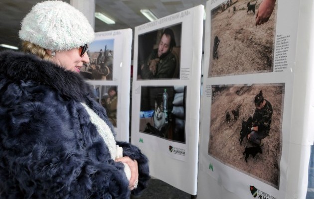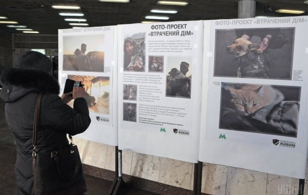 В вестибюле киевской станции метро «Золотые Ворота» открылась волонтерская выставка «Потерянный дом», на которой были представлены фотографии брошенных на Донбассе домашних животных.