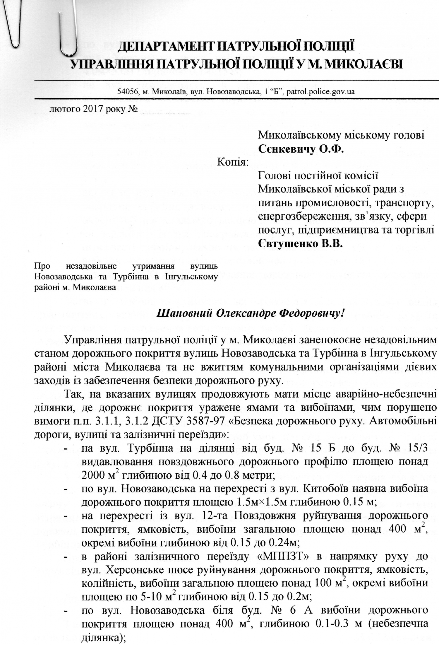 – Состояние улиц Новозаводская и Турбинная является неудовлетворительным, а на некоторых участках опасным: улица Турбинная д. 15/1, д. 15 Б, улица Новозаводская д. 6 А, д. 10, д. 20 (завод АДИС) пересечение с улицей Электронной, Волонтерской, Днепровской, – сказано в сообщении патрульной полиции.