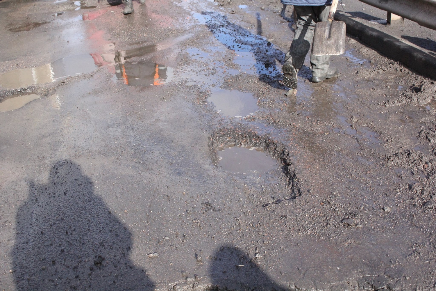 В среду, 15 февраля, работники КП «ЭЛУ автодорог» готовили ремонтные карты на Ингульском мосту, однако из-за наполнения их водой пришлось приостановить работы до полного высыхания дорожного покрытия.