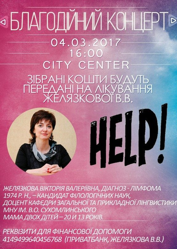 В торгово-развлекательном центре «City-Center» 4 марта в 16:00 состоится благотворительный концерт для сбора средств на лечение доцента ННУ имени В.А Сухомлинского Виктории Желязковой. Врачи поставили ей страшный диагноз – лимфома.