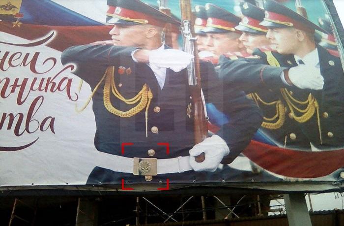 Все бы ничего, но по центру внизу изображения видна поясная бляха солдата с украинским трезубцем вместо звезды.