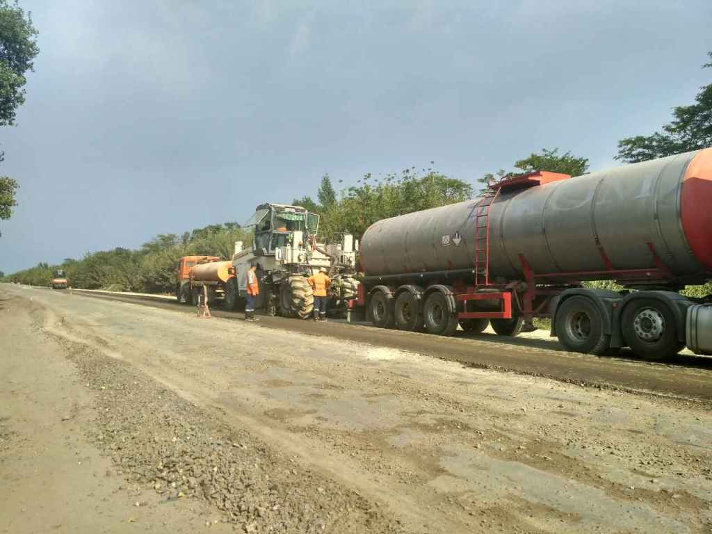 Подрядной организацией ООО «Ростдорстрой» на участке км 202 - км 219 проводятся работы по планированию обочин, фрезерованию дорожного полотна, регенерации конструктивных слоев дорожной одежды с применением битумной эмульсии и цемента машиной Ресайклер (18 000 кв2).