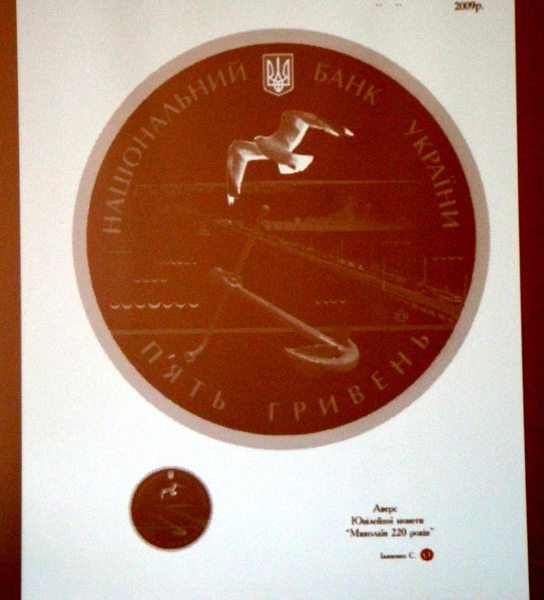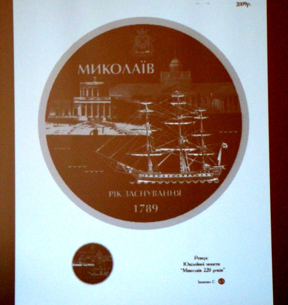 В июне он приехал в Николаев уже с полуготовыми эскизами. Художник объездил весь город, побывал на судостроительных заводах, и то, что увидел – перенес на свои эскизы. Корабль, который изображен на одной стороне монеты, - копия крейсера, который хранится в николаевском музее.