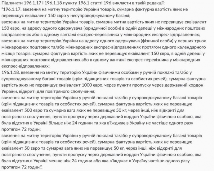 Если законопроект подпишет спикер и президент, то украинцы без уплаты пошлины смогут получать 3 посылки в месяц. Стоимость товаров в каждой из них не должна превышать 150 евро.