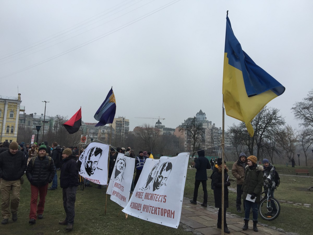 В центре Киева возле Национального музея истории Украины (ул. Владимирская, 2) около сотни активистов проводят акцию в поддержку арестованных архитекторов Александра Горбаня и Алексея Шемотюка, которые подозреваются в попытке поджога в ночь на 25 января религиозного сооружения Украинской православной церкви Московского патриархата.