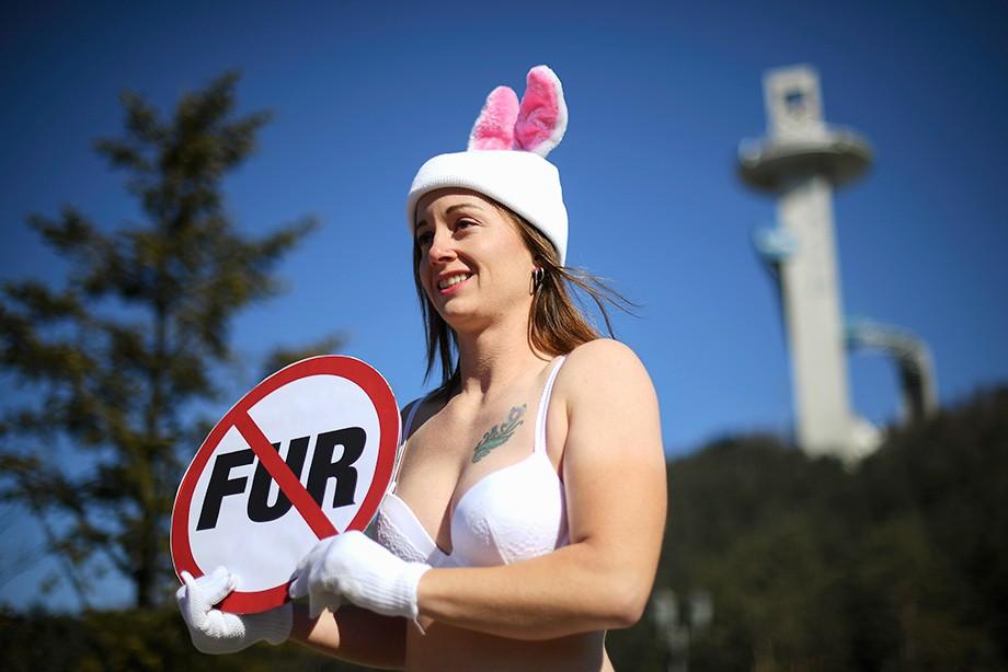 Активистка организации РЕТА (Люди за этическое отношение к животным - прим.) Эшли Фруно устроила акцию протеста в олимпийском Пхенчхане несмотря на 10-градусный мороз.