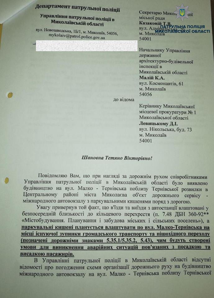 Патрульные сочли незаконным строительство автовокзала на месте Терновской развилки и попросили Казакову провести проверку