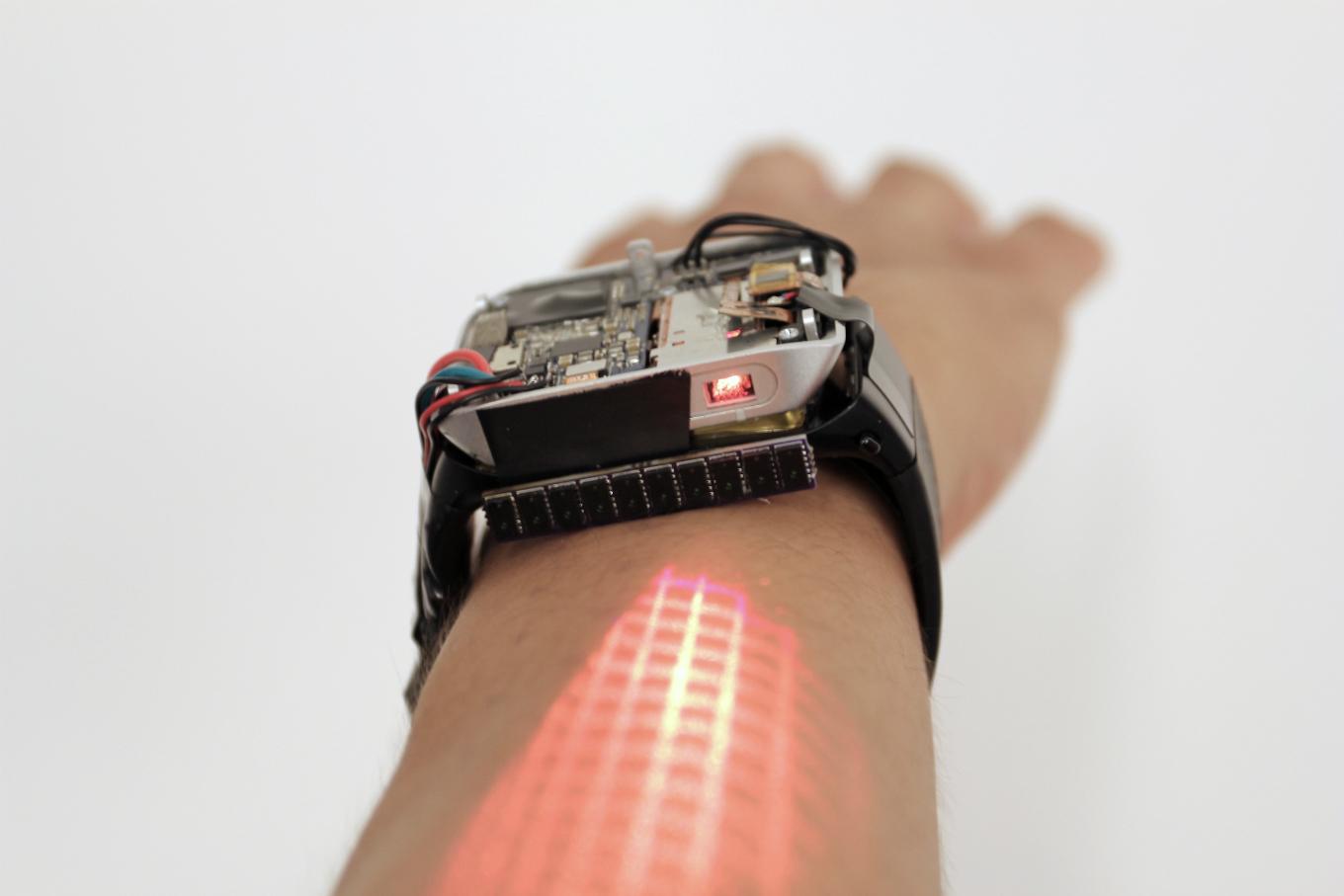 Исследователи встроили в металлический корпус «умных» часов материнскую плату, проектор, датчик глубины и аккумулятор. Проектор направляет на руку лучи красного, зеленого и синего цветов. Устройство работает под управлением операционной системы Android, а батареи устройства хватает на час непрерывной работы (при периодическом использовании батареи должны хватить примерно на целый день).