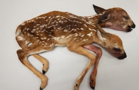 Исследовательская группа провела вскрытие, МРТ и компьютерную томографию тела в Ветеринарной диагностической лаборатории Университета Миннесоты. Они обнаружили, что у самок-оленей было одно тело, но позвоночник расходился в грудной клетке на две части, так что были две отдельные шеи и две отдельные головы.