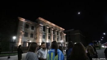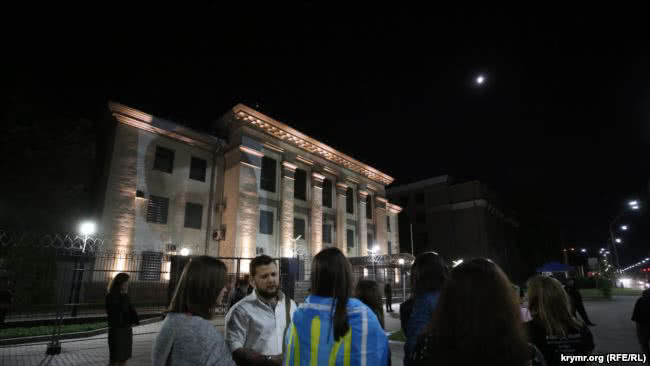В Киеве под зданием посольства РФ в Украине устроили ночную акцию в поддержку незаконно осужденного в РФ украинского режиссера Олега Сенцова и других политзаключенных.