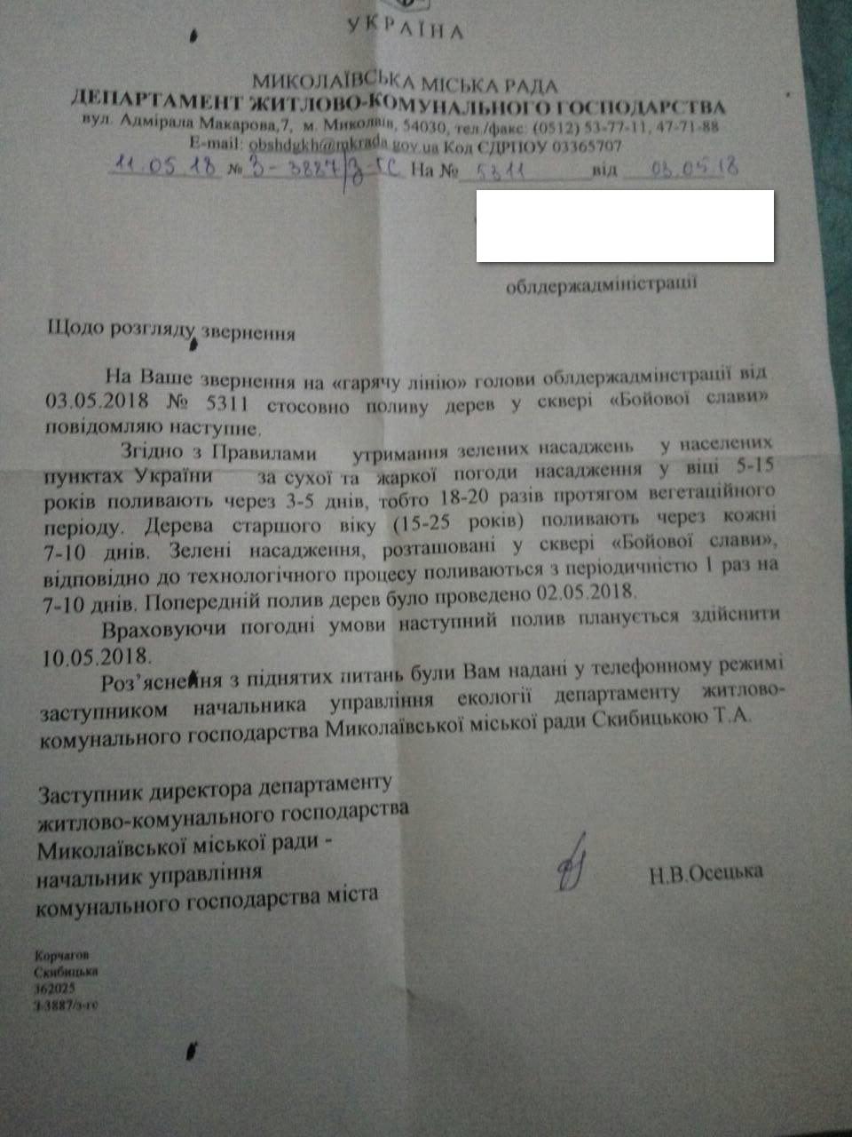 — Они испытывают наше терпение – каждый год одно и то же. В этом году началось с того, что с 27 апреля приехала машина, полила 15 деревьев, второй раз приехала машина, полила 42 дерева и снова уехала. Я жаловалась и по горячей линии Украины «1545», на горячую линию нашего губернатора, звонила в мэрию, - рассказывает Татьяна.