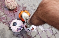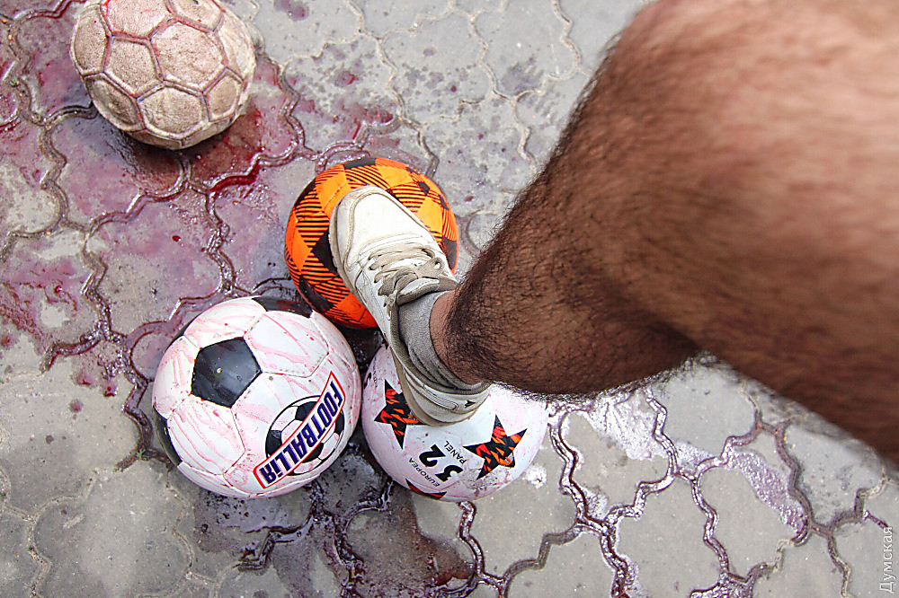В итоге участники акции облили футбольные мячи красной жидкостью и символически забили голы в «ворота Российской Федерации», перебросив спортивные снаряды через забор дипломатической миссии.