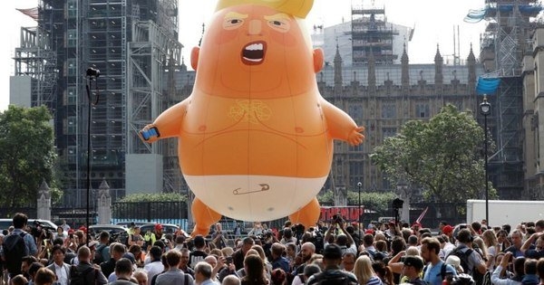 Британские активисты, протестующие против визита президента США Дональда Трампа в страну, запустили в пятницу в воздух над Лондоном гигантский надувной шар, изображающий американского лидера в виде младенца в подгузнике и со смартфоном в руке.
