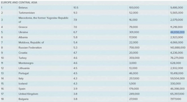 Среди стран Европы и Центральной Азии Украина оказалась на пятом месте среди стран с самым высоким уровнем современного рабства, где Беларусь - на первом, а Россия - на восьмом. Согласно данным в таблице по регионам мира, абсолютное количество жертв этого явления в Украине составляет 301 тысяча.