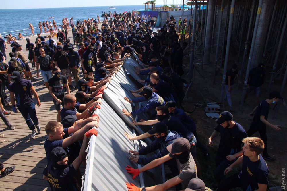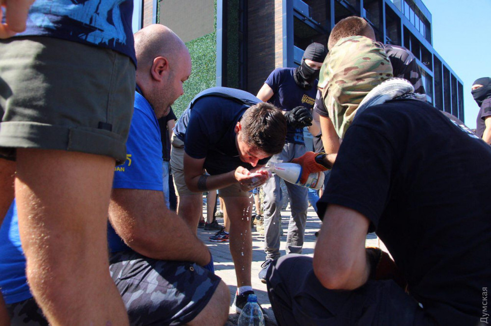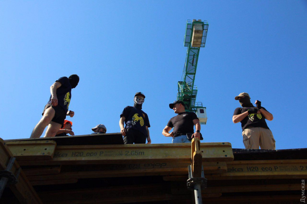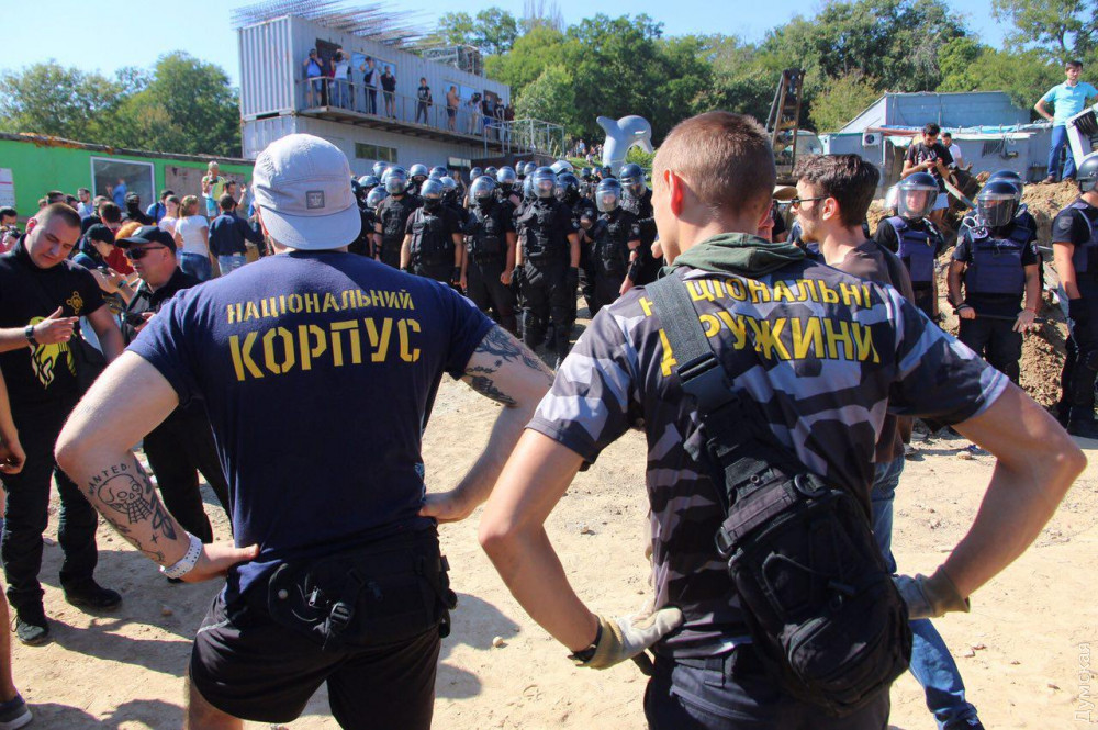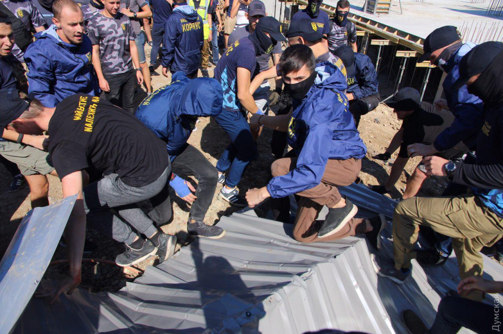 Среди них - члены «Национального корпуса», «Свободы», «Сокола», «Уличного фронта» и других, преимущественно праворадикальных групп и объединений. Они сломали забор стройки и прошли на территорию.