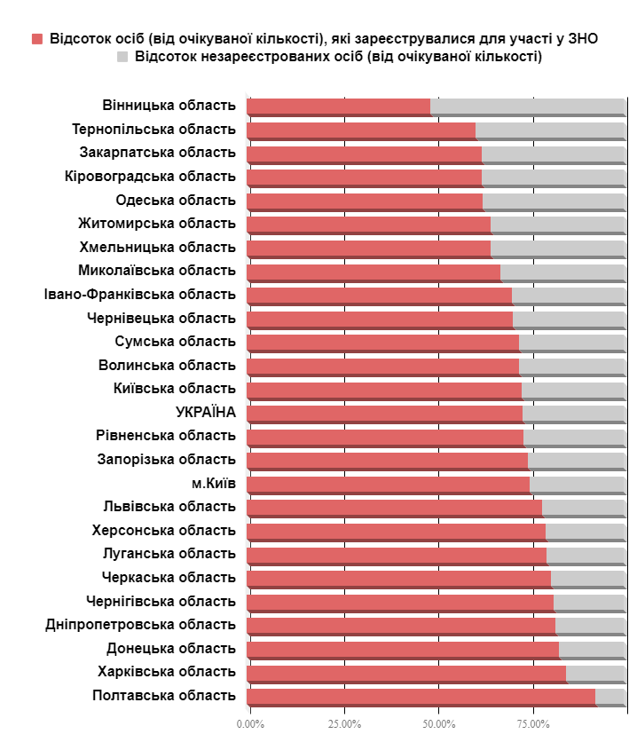 Наиболее активно участники регистрируются в Полтавской области, где процент от ожидаемого количества участников тестирования составил 92,47%. В Харьковской - 84,74%, Донецкой - 82,73%, Днепропетровской - 81,86%, Черниговской - 81,43%, Черкасской - 80,61%.