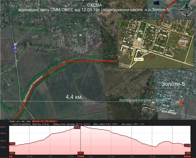— По данным отчета СММ ОБСЕ от 12 марта, в населенном пункте Золотое-5, на неподконтрольной правительству территории, команда СММ видела пробоины в оконных рамах с западной стороны школы на улице Мира. Патруль ОБСЕ проинформировал о том, что одна из пробоин была на первом этаже здания, две - на втором и еще одна - на третьем, - говорится в сообщении.