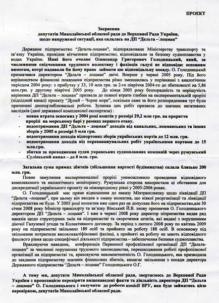 Напомним, что 7 октября 2009 года в Верховной Раде Украины был зарегистрирован проект постановления № 5203 от 07.10.2009 «О создании Временной следственной комиссии Верховной Рады Украины по вопросам расследования обстоятельств относительно возможных нарушений действующего законодательства Украины со стороны должностных лиц Государственного предприятия "Дельта Лоцман" г. Николаев».