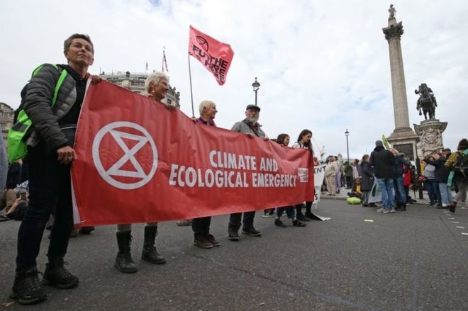 Движение Extinction Rebellion, образованное в 2018 году, требует, чтобы правительства объявили чрезвычайную ситуацию из-за состояния климата и экологии и приняли немедленные действия для борьбы с глобальным потеплением.