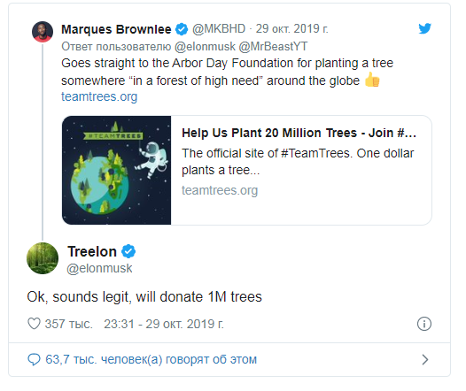 Маск ответил на твит MrBeast, инициатора кампании, с просьбой разъяснить ему суть #TeamTrees. В комментариях основателю SpaceX все объяснили, после чего он написал: «Хорошо, звучит законно. Пожертвую $1 миллион».