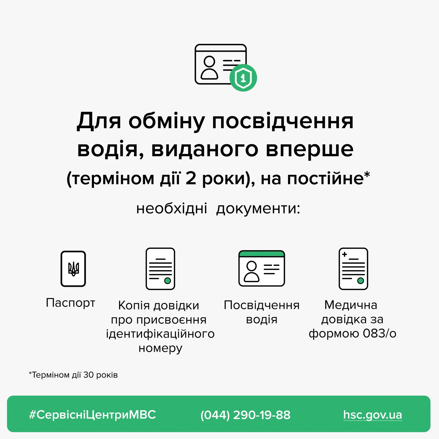 Обменять удостоверение можно в любом сервисном центре МВД, предоставив администратору паспорт, копию справки о присвоении идентификационного кода, медицинскую справку о пригодности к управлению транспортным средством (форма 083/у) и имеющееся водительское удостоверение.