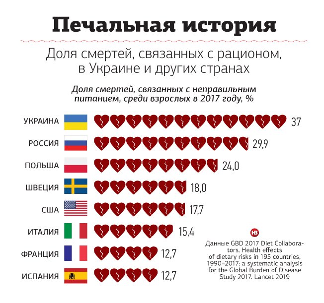 Его также сопровождает инфографика, которая отображает долю смертей, связанных с неправильным питанием, в Украине и других странах.