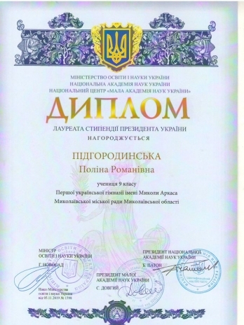 Как рассказал Сергей Бережной, 25 ноября ученица 9 класса Полина Подгородинская получила Диплом лауреата стипендии Президента Украины, который девушке лично вручила министр образования и науки Анна Новосад.