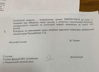 В проекте решения также говорится: «Запретить на территории города Ровно пропаганду различных видов девиантного полового поведения, в том числе в форме так называемых «маршей равенства», «прайдов», «фестивалей квир-культуры» и т.п., проходящих в местах массового досуга семей с детьми».