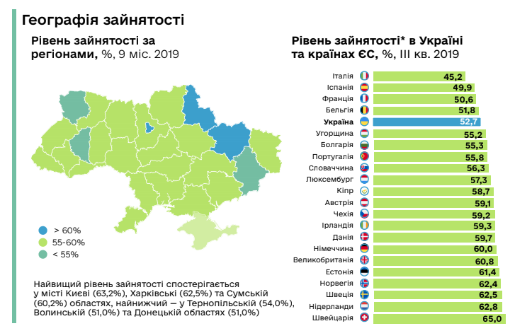 Также отмечается, что Украина занимает одно из последних мест по уровню занятости – 52,7%, опередив такие страны, как Бельгия – 51,8%, Франция – 50,6, Испания – 49,9 и Италия – 45,2%.