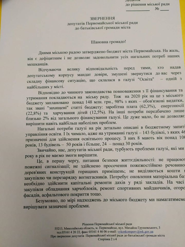 В обращении сказано, что депутаты вынуждены просить помощи у родителей из-за того,что бюджет на 2020 год принят с дефицитом в более чем 20 миллионов гривен.