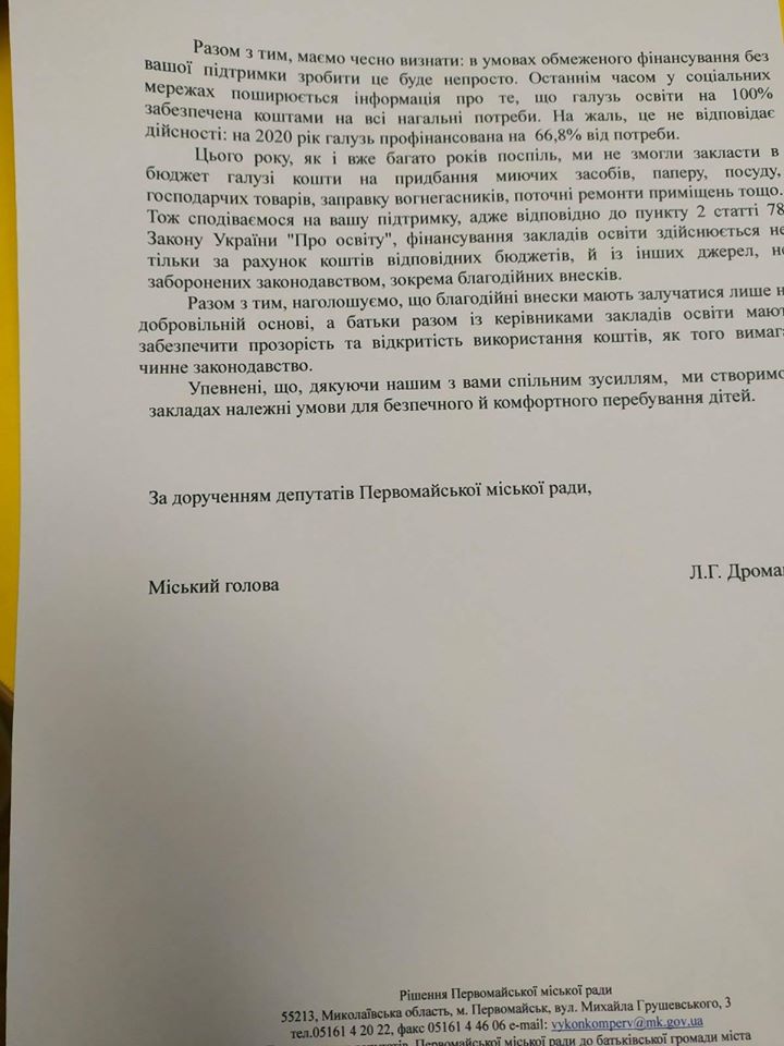— Не работают пожарные сигнализации, не осуществлена пропитка пожаростойким веществом деревянных конструкций чердачных помещений; не выделяются средства на закупку или перезарядку огнетушителей. Нуждается в обновлении материальная база, необходимо осуществить капитальные ремонты крыш в ряде заведений. На очереди - закупка оборудования пищеблоков, ремонт спортивных площадок, ограждений, фасадов, асфальтового покрытия и тому подобное. Безусловно, по мере поступлений в городской бюджет мы будем стараться решать указанные проблемы. Вместе с тем, должны честно признать: в условиях ограниченного финансирования без вашей поддержки сделать это будет непросто. В последнее время в социальных сетях распространяется информация о том, что отрасль образования на 100% обеспечена средствами на все насущные потребности. К сожалению, это не соответствует действительности: на 2020 год отрасль профинансирована на 66,8% от потребности. В этом году, как и уже много лет, мы не смогли заложить в бюджет области средства на приобретение моющих средств, бумаги, посуды, хозяйственных товаров, заправку огнетушителей, текущие ремонты помещений и тому подобное. Поэтому надеемся на вашу поддержку, ведь в соответствии с пунктом 2 статьи 78 Закона Украины Об образовании, финансирование учреждений образования осуществляется не только за счет средств соответствующих бюджетов, и из других источников, не запрещенных законодательством, в частности благотворительных взносов, - сообщают депутаты.