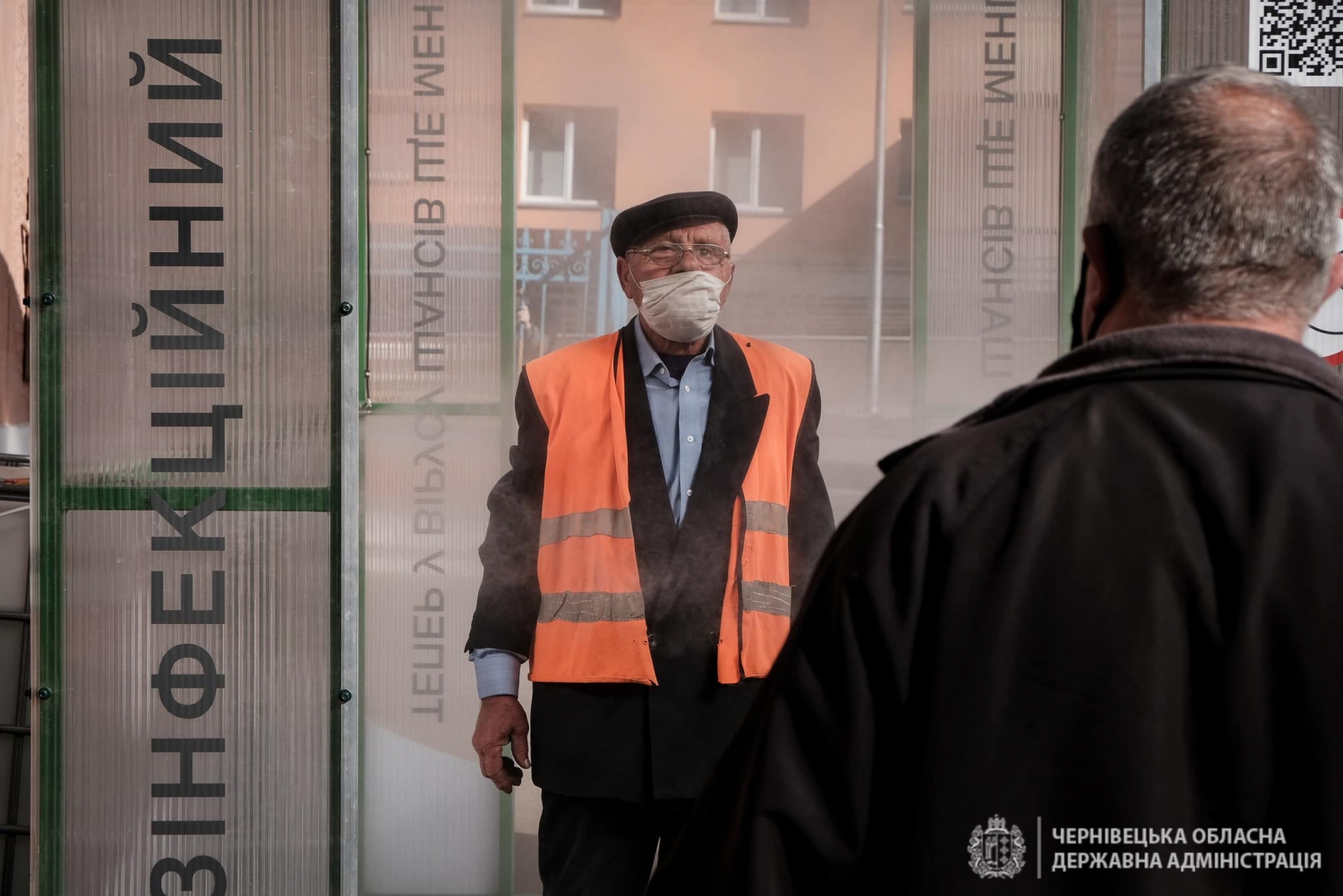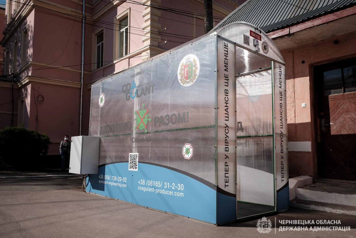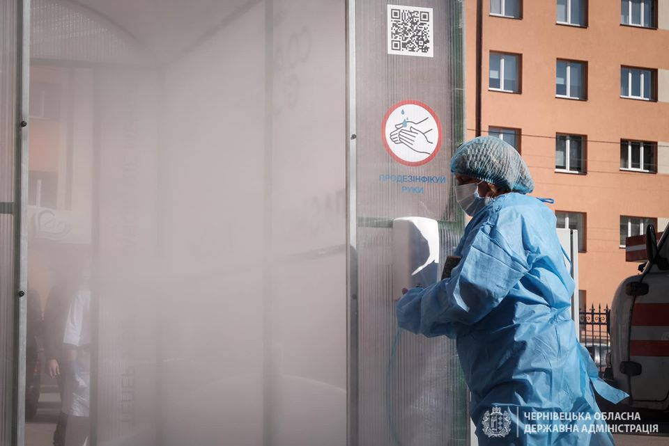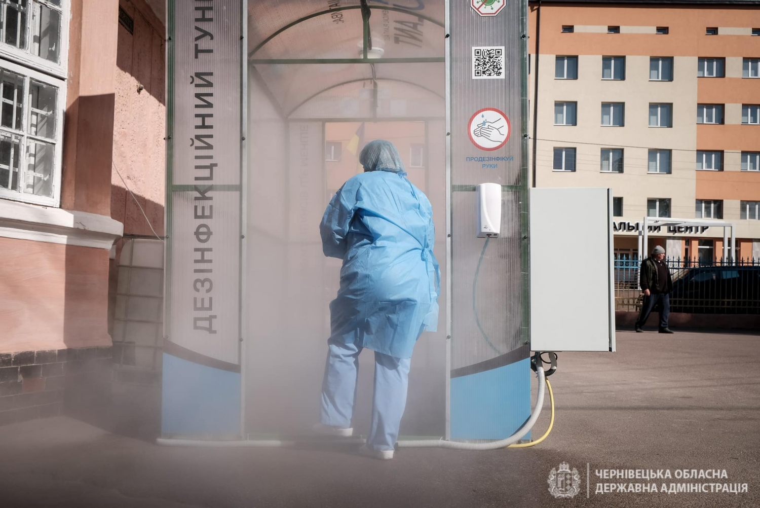 Возле здания Черновицкой областной больницы установили тоннель, который распыляет дезраствор, убивающий бактерии.